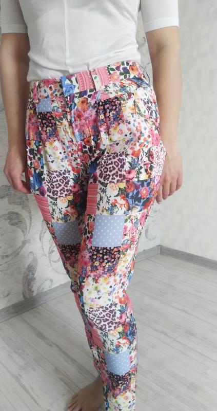 Летнии яркие брюки из легкого материала с кармашками ПОТ 34,5 см посадка 25 см ПОБ 49++cм длина 95 см Указан размер 26,смотрите по параметрам штанина зауженная внизу 14,5 см