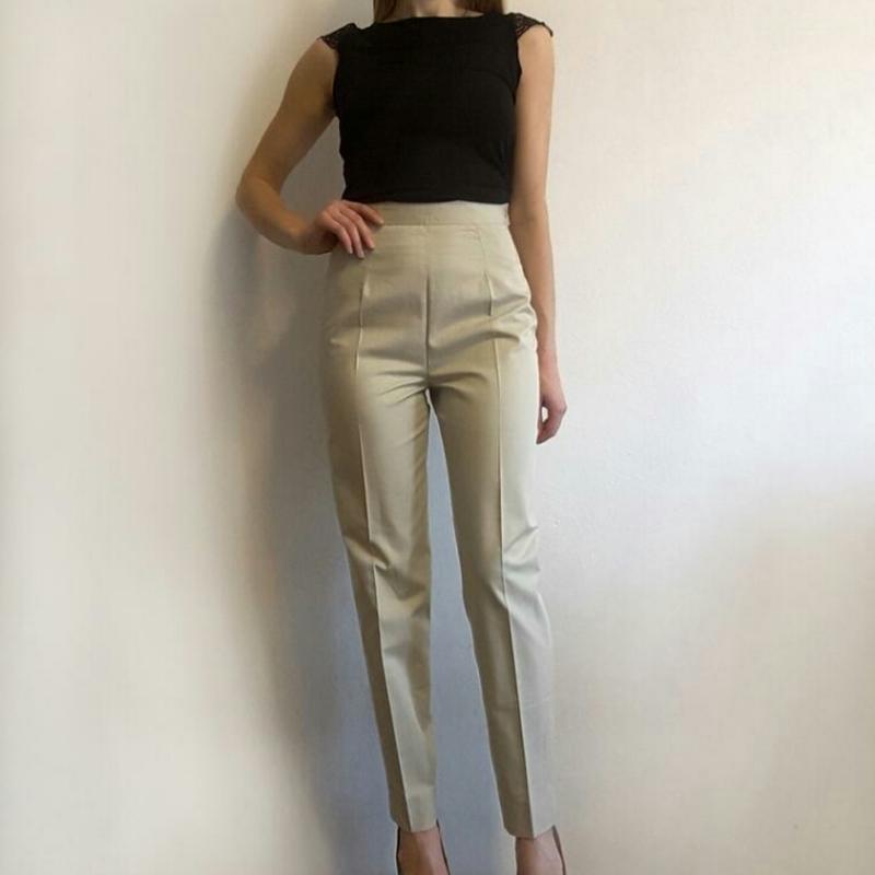 Стильные брюки песочного цвета с высокой посадкой. Застежка: пуговка и молния сбоку. РазмерXS-S пот-32см поб-47см посадка-31см длина по боковому шву-102см