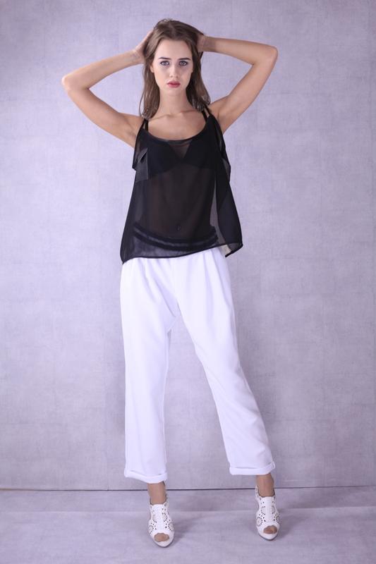 Брюки свободного кроя, декорированы велюровыми лентами по поясу.