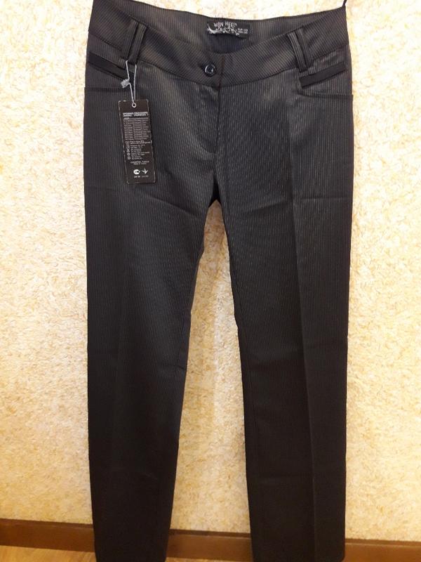 Чорні класичні брюки в сіру смужку, трошки кльош. Розмір пише європейський 40 але більше підійде на 38. Є маленька затяжка від бірки, нитку можна заправити в виворіт Бренд інший!!!