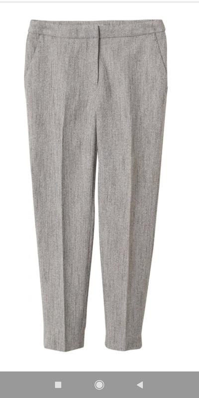 Укороченные брюки, хорошая удобная посадка, талия стандартной высоты, скошенные боковые карманы, светло серая приятная ткань, рисунок ёлочка. По отзывам на сайте идеальные брюки соответствуют размеру, пояс 84 см, посадка 24/36, длина по боковому шву 91 см.