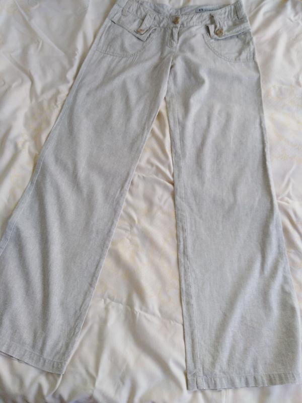 Льняные летние брючки, пот 42, поб 52,длина 105, по внутреннему шву 86, посадка 23 спереди, 28 сзади, ширина на уровне колена 26, низ27,5 см, по бирке размер 40, без дефектов, есть следы носки.