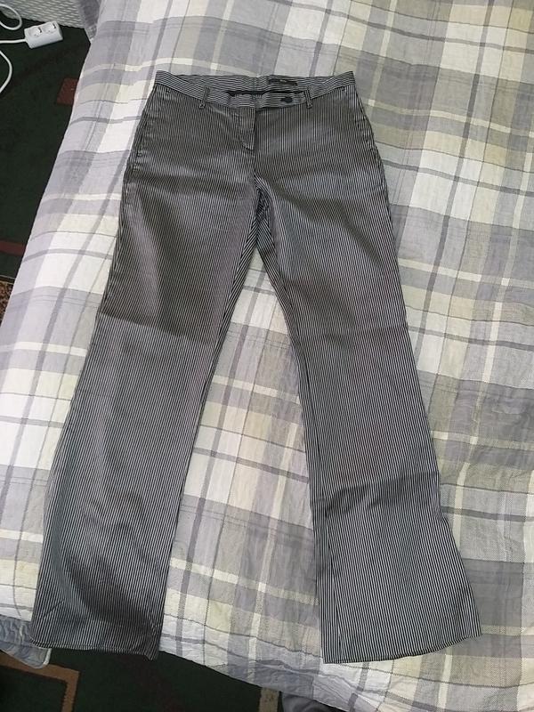 Брючки дуже тонкі легкі ефект 3 Д. смужка сіро чорна)сидять по фігурі бавовна, шовк.на С-М орієнтуйтеся по замірах.довжина 104 пояс 40 посадка перед 26 зад 31 стегна 47 довжина по внутрішньому шву 81 штанина низ 26