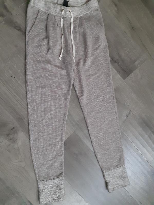 Мягусенькие трикотажные штанцы ,с манжетками внизу,пояс на широкой резинке и шнуровке.Размер S.Идет на свой размер.