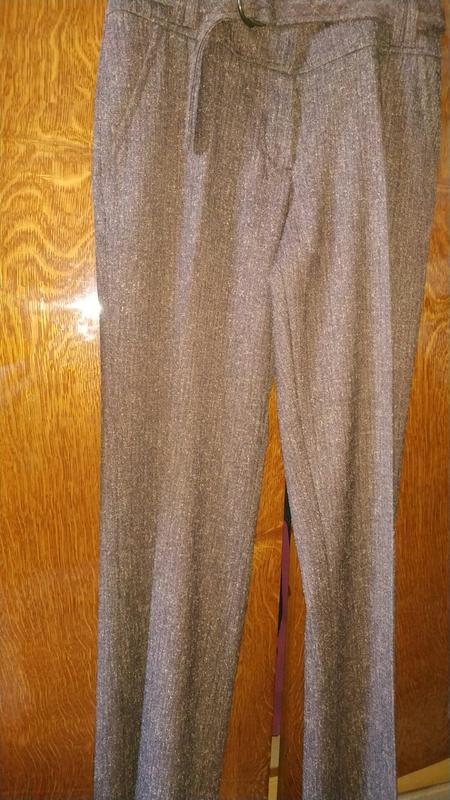 коричневые классические брюки. ткань выглядит как букле. очень красиво смотрятся. коленки и попа не лоснятся. замеры: пояс 35 см посадка 24 спереди (35 сзади)см длина внешняя 104см, внутр. -81 см