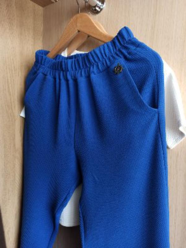 Брюки трикотаж с карманами,пояс на резинке,не мнутся, очень практичные. Цвет электрик. Компаньон к брюкам с такой же ткани футболка белого цвета.Круизная коллекция.