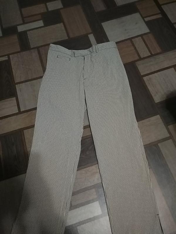 очень классные брюки в клетку,материал похож на плащевку,но отлично тянется.пот-41, поб-54-55 см,до по внешнему шву -104, по внут-80 см
