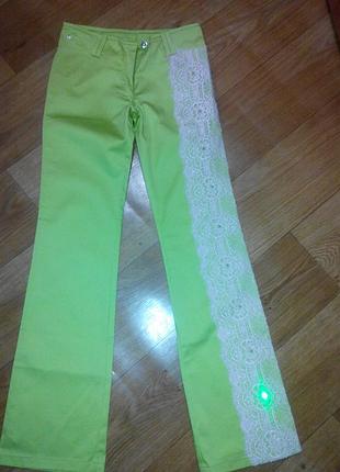 Ярко салатовые брючки,с кружевом и со стразами зеленого цвета размер 25-26