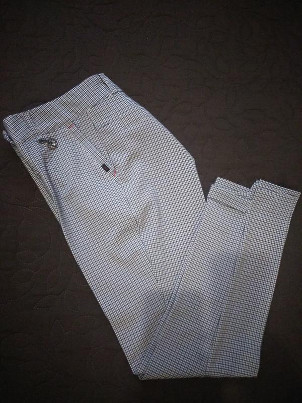 Брюки новые в мелкую клетку, сзади два кармана-обманки. ПОТ -38, ПОБ-48, длина по внешнему шву 94, по внутреннему 73 см. Цену обсудим
