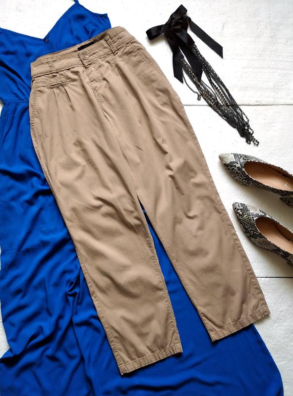 Легкие хлопковые брюки. Указан 38 размер, но идут на больший, смотрите замеры. ПОТ 42 ПОБ 54.5 Длина 91.5 Шаговый шов 65 Посадка 28/34.5 Ширина штанины 31/17.5