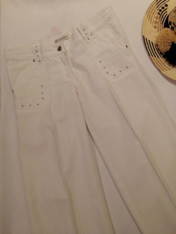 Белоснежные брючки ( фото не передает цвет). Без нюансов. Красивая фурнитура. Качество супер. К низу немного расширены. Размер M или небольшая L. Замеры : ПОТ 42, ПОБ 50, посадка спереди 23, длина 99, шаг 78. Немного тянутся. Возврата и обмена нет.