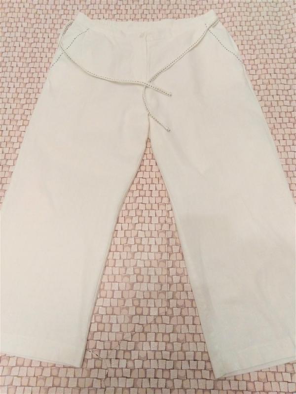 Шикарные лёгкие брюки с прекрасным составом ткани из натуральных волокон. Чисто летний вариант для повседневной носки или для отдыха на море. Длина 87см,длина по внутреннему шву 59,пояс 41, бедра 57, посадка перед 28, посадка зад 41, выход 27. Ориентируйтесь по замерам. Всем желаю удачных покупок.