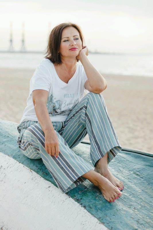 Брюки натуральный лён, приятные к телу, стильная модель на завязке ПОТ 41 если растянуть резинку в спокойном состоянии 36 Посадка перёд 30 Спинка 34 Длина 104 + 4