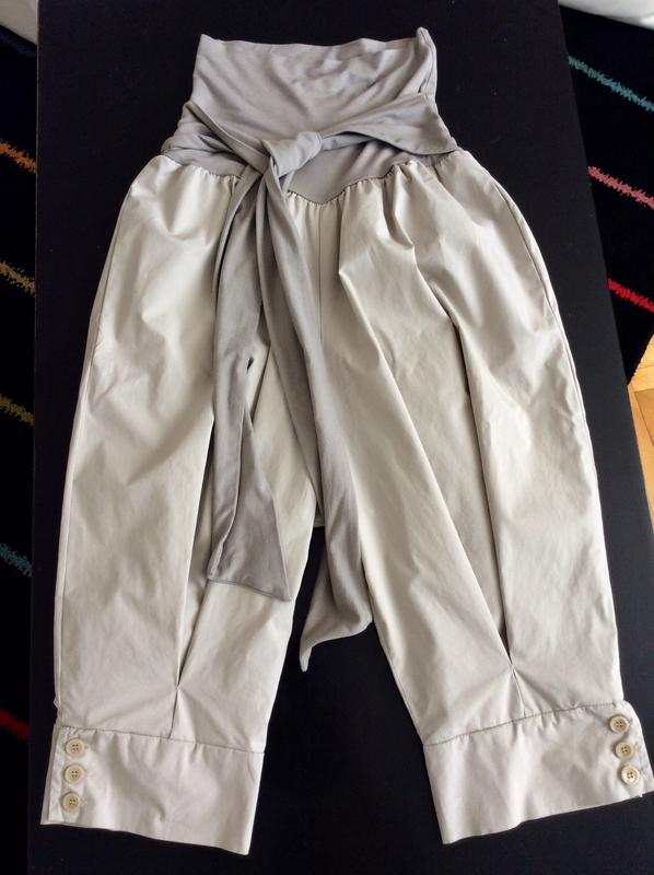 Модные штанишки Imperial в серо- бежевом цвете. Состояние идеальное, без нюансов. Хлопок типа тонкой плащёвки, хорошо драпируются с приятным шуршанием, снизу собраны на манжет с тремя пуговицами , по боковым швам два внутренних кармана ,в талии вставка из тоненького трикотажа с длинной лентой. Указан S размер. Поб ( полуобхват) в талии : верхний край трикотажного пояса-27 см, тянется до 37 см., нижний край трикотажного пояса-31 см,- тянется др 41 см., Поб бёдер( складки в расправленном состоянии)-60 см., Поб нижнего края по манжету-17 см., Длина по боковому шву( от верхней точки трикотажного пояса)- 80 см., Длина по внутреннему шву-31 см., Длина ленты-70 см.