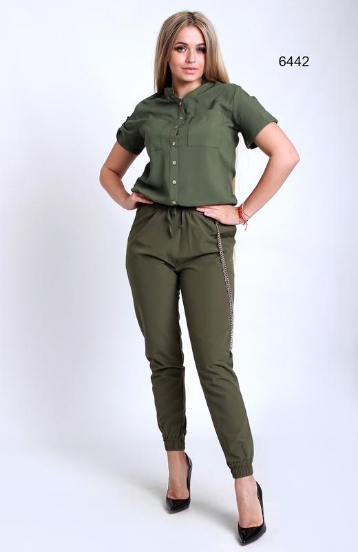 классные джогеры украшены съемной цепочкой,цвет хаки, на резинке, без завязок и пояса, карманы по бокам прорезные, сзади один накладной.