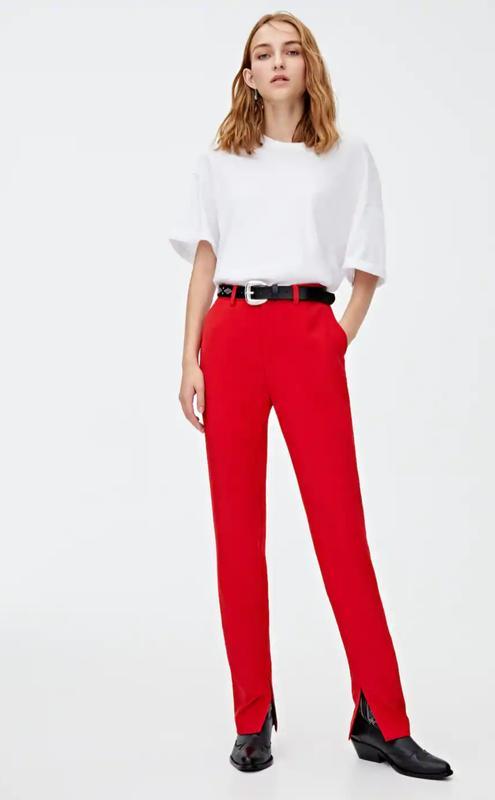 Новые, с бирками брюки Pull&Bear в потрясающем красном цвете. Качество шикарное. Под белую или черную футболку просто огонь.) Размер S, но идет на XS.