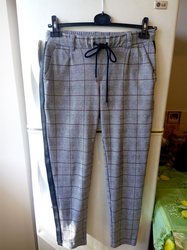 Брюки в полоску на резинке, состояние идеально,сбоку лампасы с экокожи, два кармана, стиль полуспортивный, размер М. состав коттон, полиэстер, эластан, ПОТ не растягивая 40, ПОБ 55 высота посадки спереди 24, сзади 36, длина 98, полуширина брючины по низу 16