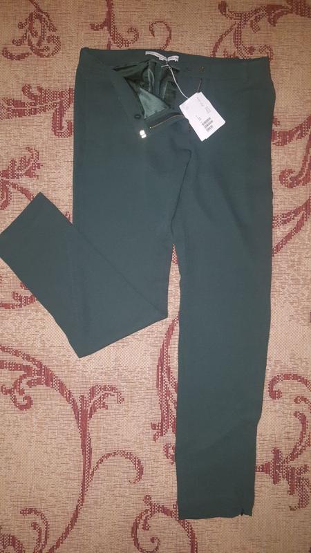 Класичні завужені, колір зелений спокійний. З замочками внизу штанин.Позаду імітація кишень. Підійдуть на дівчину зростом +-170, укоротити не вдасться через замочки. Довжина штанини по внутрішньому шву 81см. В поясі- 82-84 см, в стегнах до 106 см.
