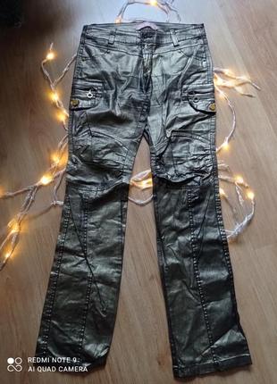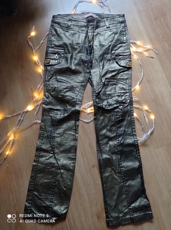 Брюки золотого цвета. Смотрятся очень круто. На камере к сожалению не показывает цвет, ближе к тому что на последнем фото. Бедровки. Пояс 40, тянутся до 45. Бедра 48, тянутся до 55. Посадка 22. Длина с внешней стороны 102. Длинна с внутренней стороны 82.