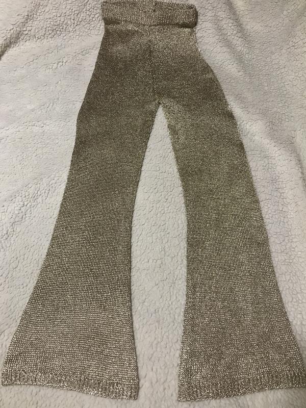 Люрексовые,нарядные, блестящие с высокой посадкой,с клёшем.Длина 112 см;П.О.Т.32 см;П.О.Б.46 см;ширина клёша 28 см;высота посадки 37 см