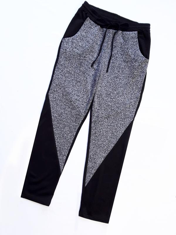 Casual брюки Cute Ann Размер XXL Интересное сочетание двух фактур---меланжевой вязки и черного трикотажа Боковые и задние карманы Пояс резинка 36 -51 см Бедра 51-61 см Посадка 31 см Длина 102'см Ширина штанины внизу16 см Идеально тянутся Трикотаж средней плотности