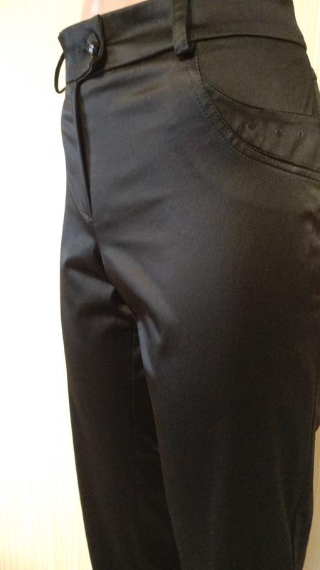 черные классические брючки.ткань стрейч с эффектом блеска кожи,средней плотности.5%-эластан,95%-вискоза.ПОТ-34 или 40 за счёт пуговок сзади на поясе.признаки носки отсутствуют.торг уместен.(при покупке от двух лотов любой третий до 95 грн в подарок)
