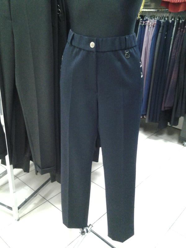 брюки тёмно-синие(почти чёрные, цвет на фото не соответствует). брюки с высокой посадкой, зауженные к низу. ткань габардин с лёгким стрейчем. на всё ширину поясв вставлена широкая резинка, что обеспечивает хорошую посадку на фигуре.