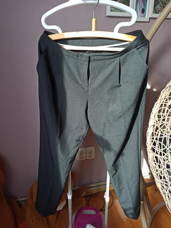 штани чорні поліестер з підкатами внизу завужені, трішечки тягнуться, полуобхват талії46, полуобхват бедер 61, полуобхват бедра 33. довжина від пояса 98, карманчики присутні