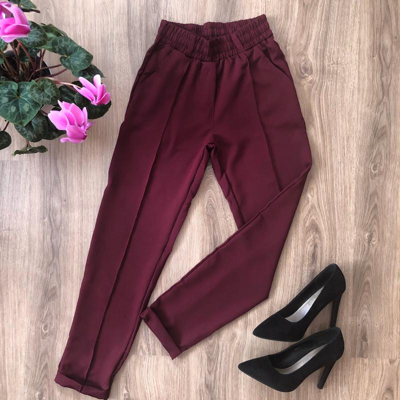 Жіночі брюки, є бокові кармани, колір бордо, розміри 42, 4 Заміри Розмір 42 Бедра 42 см Довжина від резинки 87 см