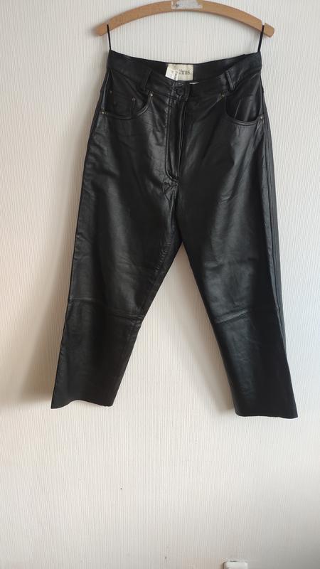 талія 79-80 см стегна 110 див. макс. краще, щоб сиділи вільно є підкладка довжина 94 см край не оброблений Вгорі стегно 31см по низу 22см. шкіра трохи щільніше, ніж на попередніх брюках, (не напа) класичний "джинсовий" п'яти кишеньковий крій) фурнітура - латунь відмінне вінтажне стан