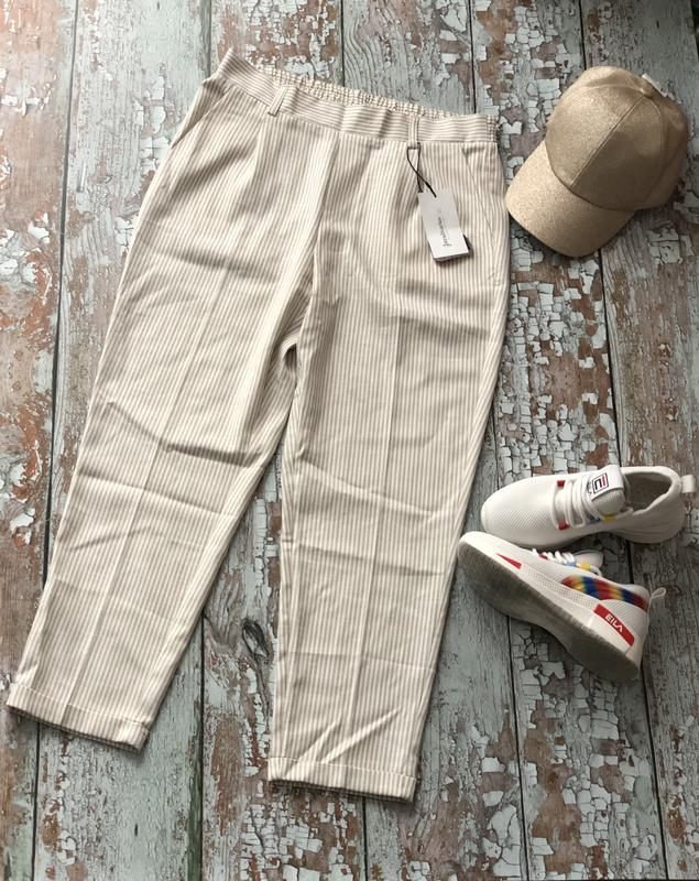 Брюки Stradivarius в стиле casual. Стильная расцветка - белая в бежевую вертикальную полоску. Безумно удобные и легкие. Сзади на резинке и с карманами спереди. Размер L. Абсолютно новые, с биркой. Все замеры вышлю по запросу. Белый топ/ майка продаётся отдельно.