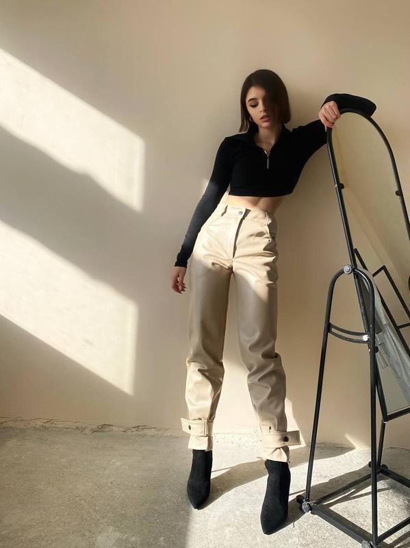 Стильные брюки из эко-кожи на замше, высокая посадка, ремешки на лодыжках