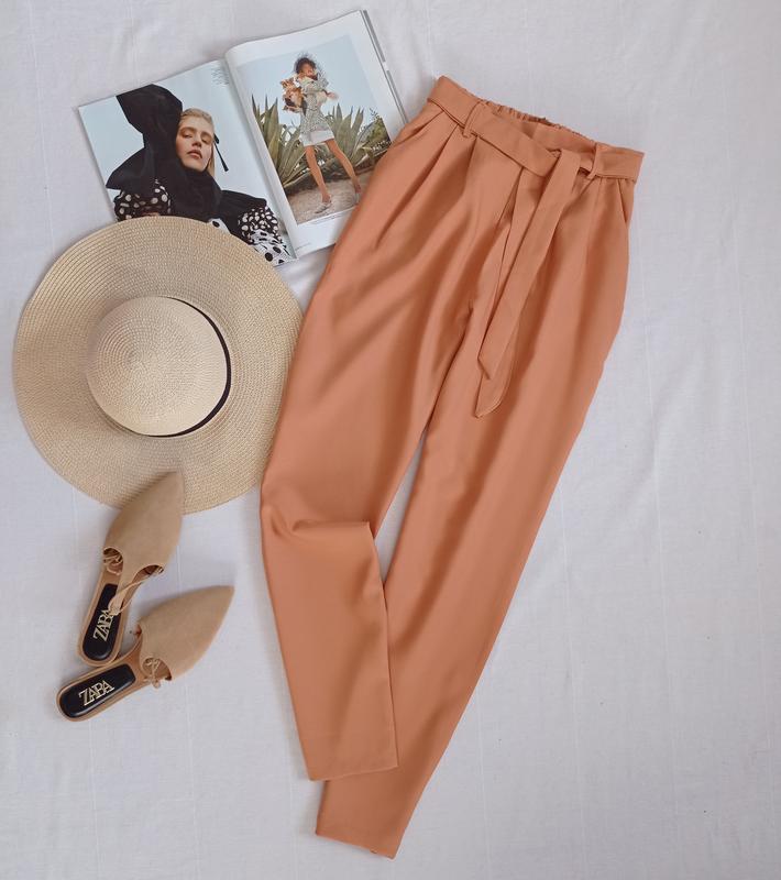 Красиві брюки високої посадки з поясом і бічними кишенями, завужені до низу, тканина поліестр, розмір М, ширина поясу 30 см, стегон 53 см, довжина 100 см, висота посадки 30 см