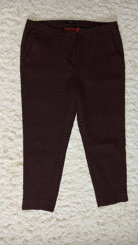 Ткань стрейч. Состав : 59% полиэстер, 38% котон, 3% еластан. Производство Турции. Сзади на левой штанине есть пара затяжек, дырок нет, затяжек почти не видно (на фото) Длинна по внутр шву - 59см Длинна по внешнему шву - 85см Посадка по переду - 29см Посадка по заду - 35см ПО по поясу - 42см ПО бёдер - 51см