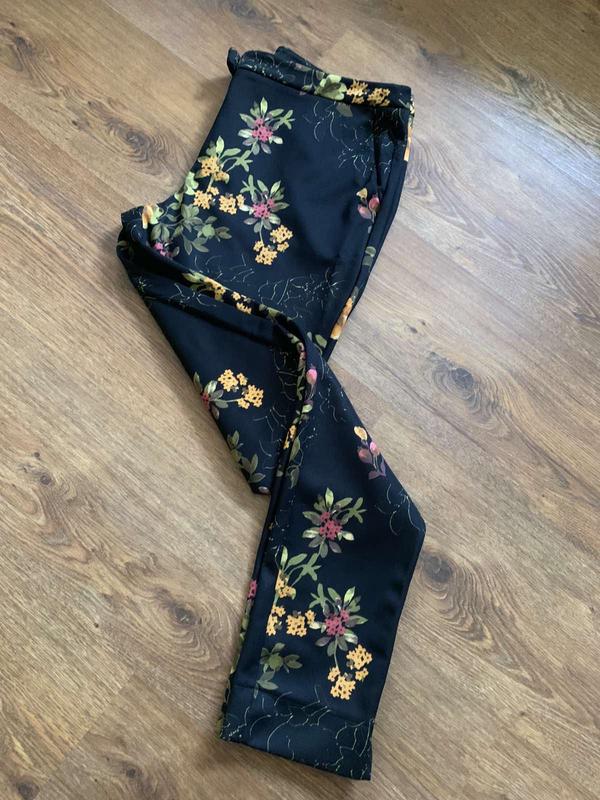 Состояние идеальное Турция Чёрного цвета с рисунком Застегивается на молнию кружок и пуговицу Есть два кармана Плотные Тянутся К низу зауженные В низу брюк разрезы по 5см Состав 93% полиэстер 7% эластан Замеры Пот 41 Поб 52 Посадка 24/34 Длина 97 Низ по 15