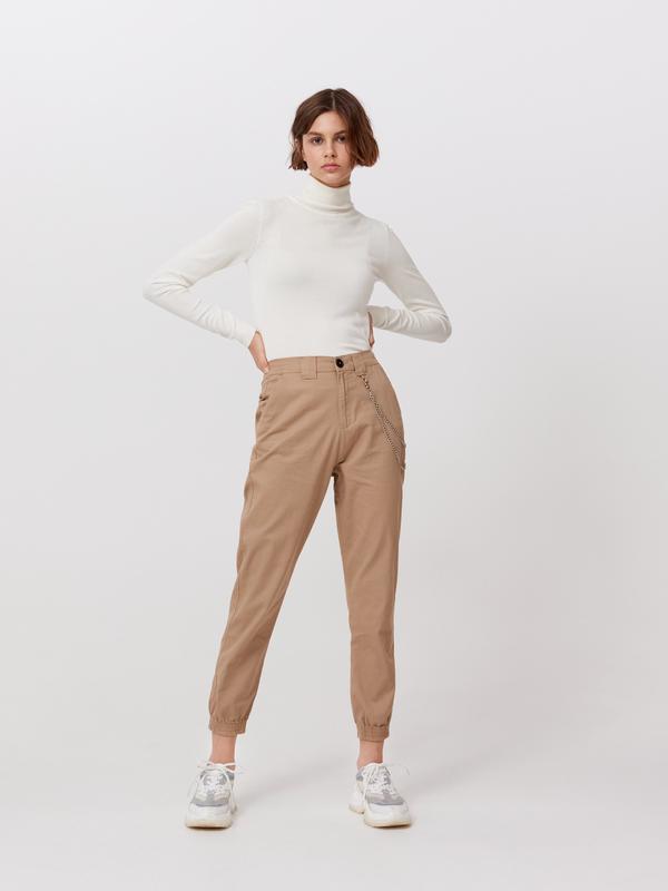 Джоггеры с завышенной талией и цепочкой, застежка на молнии и пуговица, штанина с резинкой внизу. Размер L, на параметры: рост 176 см, обхват талии 76 см, обхват бедер 102 см, длина по внутреннему шву 84 см. Брюки новые с биркой. Не подходит размер.