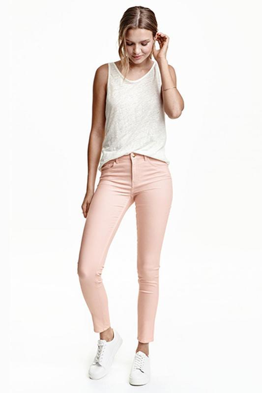 брюки суперстретч H&M разм. 46 № 0355953025 Мерки: пояс 46см, поб 51см, длина 102см, шшв 16см, шшс 30см Брюки с пятью карманами из суперэластичного стираного твила. Узкие брючины и талия стандартной высоты. Цвет: светло-розовая пудра Состав: 59% хлопок, 39% полиэстер, 2% эластан Вид товара: с бирками