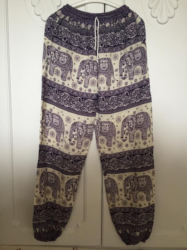 Легкие брюки на жару, есть два кармана, низ на резинке. Длина 110 см, ширина в бёдрах 56 см, носились на размер S ,подойдут и на M. По шву ниже кармана разошлась ткань ( см 2 в длину), ремонт возможен .