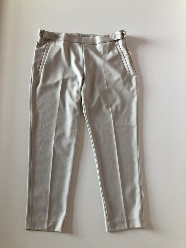Интересно сделаны на талии, на вид как лён Длина по боковому шву 90, внутренний шов 77, пояс 45, поб 54, посадка впереди 27, посадка сзади 41,ширина штанины в районе паха 33, в низу 17, тянется
