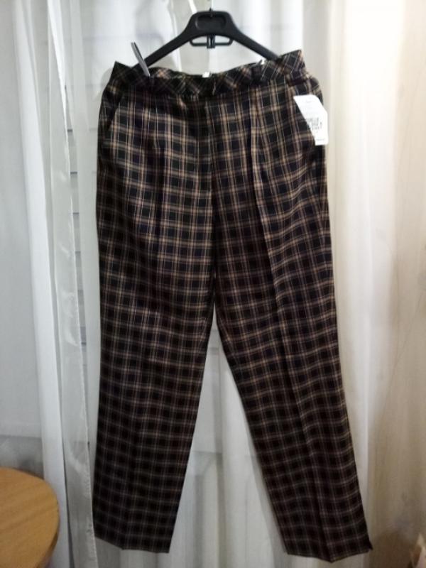 цвет коричневый, черный в клетку, ткань полieстерн, размер 36-38, смотри замеры:талия 37,5, бедра 49, длина 102 с боку розризы, ширина штанины в ляске 31, 5, низ ширина20, посадка перед 27, посадка зад 43(глубокие), пошаговый 78