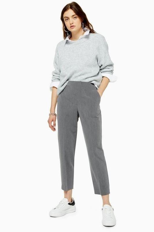 Класичні штани темного сірого кольору Пояс на половину на резинці, на кант Тонкий матеріал На етикетці зазначено розмір 56, але маломірять ПОТ 41 ПОБ 51 Посадка спереду 34,ззаду 39 Ширина штанини під ширінкою 31, внизу 22 Довжина по зовнішньому шву 99, по кроковому 68
