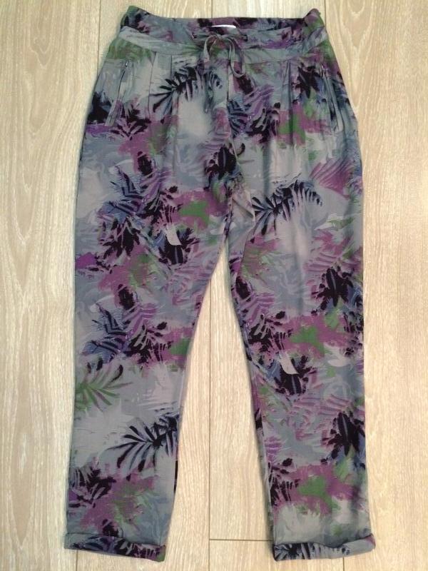 Лёгкая ткань,есть карманы на молнии.По поясу-36,по бёдрам-54,длинна-85,длинна по внутреннему шву-59,высота посадки по заднему шву-36,по переднему шву-30,ширина штанины по низу-15. Доставка: Новой почтой или Укрпочтой после 100% оплаты на карту приват банка.