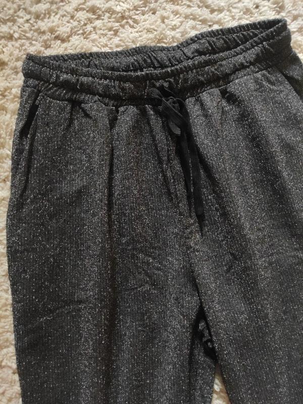 штанишки с люрексом, джогеры, в идеальном состоянии, снизу резинка, размер м, по талии полуобхват 33 см в не растянутом состояние резинка, очень хорошо тянется, длина штанов 101, по бокам карманы