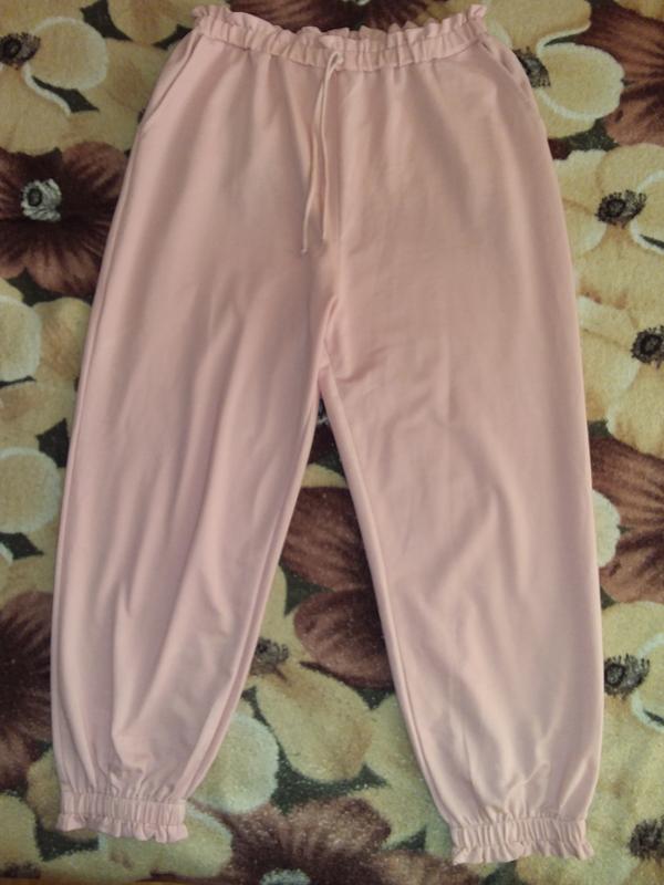 Размер на этикетке евро 40/42, будут на больше, смотрите замеры. Ткань средней плотности, немного тянется, 65% хлопок, 35% полиэстер. Состояние хорошее, есть нюансы - см. последнее фото и легкая кашлатость. Цвет розовый, не яркий, немного ярче, чем на фото. Длина по боковому шву 96. По внутреннему 62. П/о в поясе (резинка) 37 тянется до 53. П/о бедер 57. П/о штанины вверху 33, внизу 14 тянется до 21. Высота посадки от шва-развилки к верхней точке пояса 35. 29.