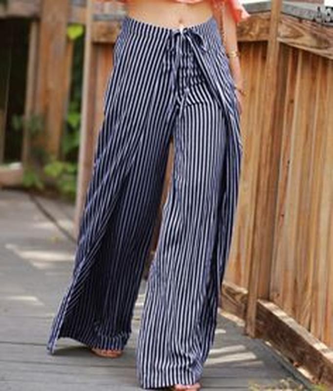 В наличии Бохо широкие штаны-юбка с запахом (по бокам).палаццо юбка-брюки без боковых швов .пояс-завязках.По бокам закругления и можно пояс завязывать перед-спинка и наоборот(как фартух).Высокая посадка Универсальные практичные комфортные.ВСЕ оочень скрадывают-и за счет фасона и за счет ткани. ткань немнущаяся жатка-вискоза не просвечивает-но ткань легчайшая приятная дышащая.фон темно-темно синий с тоненькой белой полоской-ненавязчивая всегда модная классика Состав-80% вискоза,20% пэ талия 94-120см-регулируется завязками полуШирина штанины 58см-по вашей ноге-остальное на запах сбоку длина-92-93см высота сидения-37*2 длина завязок-по 42см