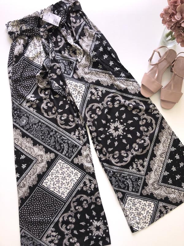 Штани H&M вільного крою Нові Розмір 12 Заміри Довжина 107, піт 37 тягнеться до 48 на резинці, побіди 55, посадка 35/45, ширина штанини верх 35/40, кроковий шов 72. Склад 100 Віскоза