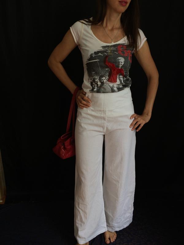 Белые натуральные широкие брюки. Одетые на девушку рост 167 см, фигура 92х74х96 см. Ответим с удовольствием на ваши вопросы