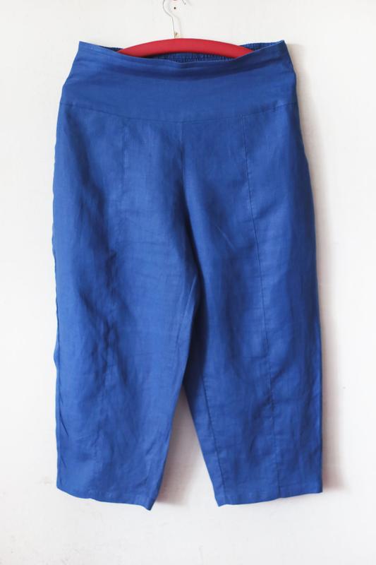 Укорочені лляні штани Masai 100% льон Данія Дефектів і нюансів немає. НОТ 37см, резинка , тягнется до 49см НОС 58см Вистота посадки перед/спинка 33/43см Довжина 84см Довжина крокового шва 54 см Напівобхват штанини вверху/внизу 35/21см