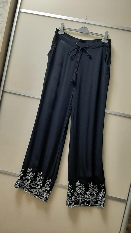 Классные брючки от Marks&Spenser,из натуральной вискозы,по бокам с карманами,на поясе резинка и кулиска,по низу украшены вышивкой🌺 Цвет насыщенный чёрный 🖤 Размер написан 12uk ткань немного тянется,одеты для примера на 12/14 размер Смотрите замеры: длина по боковому шву 108 см. длина по внутреннему шву 73 см. пояс 42 см.тянется макс до 54 см. бедра 59-60 см. посадка 42/45 см. ширина штанин после посадки 33-35 см. ширина штанин по низу 27.5 см.