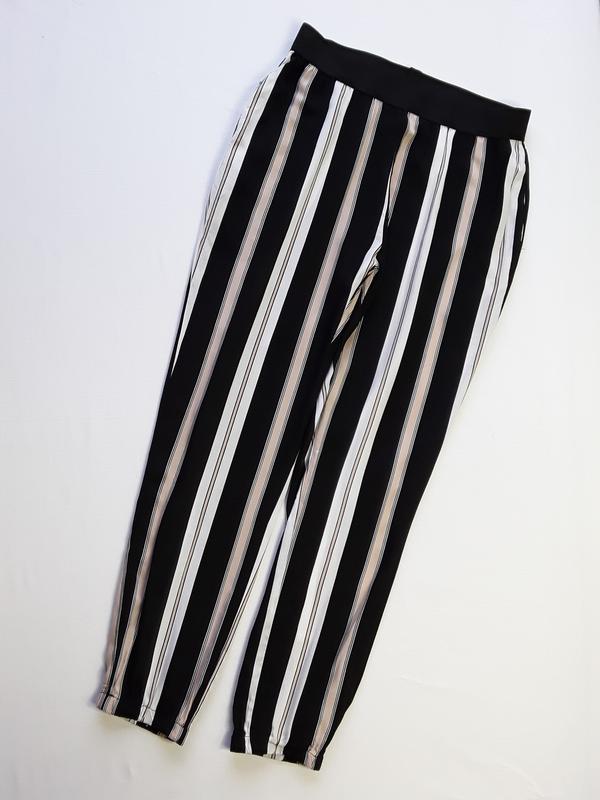 Стильные джоггеры Select Кармашки в боковых швах Красивое сочетание полосок-пудровой,черной и белой Размер 12 Пояс резинка,36 см Бедра 54 см Посадка 28 см Длина 95 см Комфортная тонкая вискоза